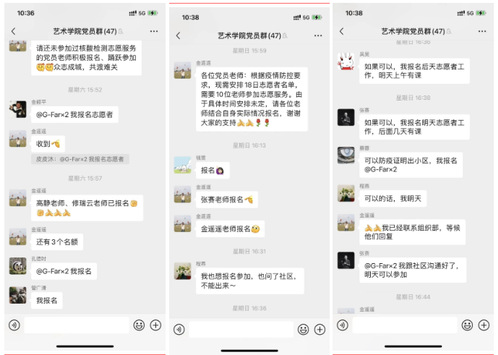 志愿者紧急招募信息一经发布,艺术创意学院教工党员群内报名热烈。