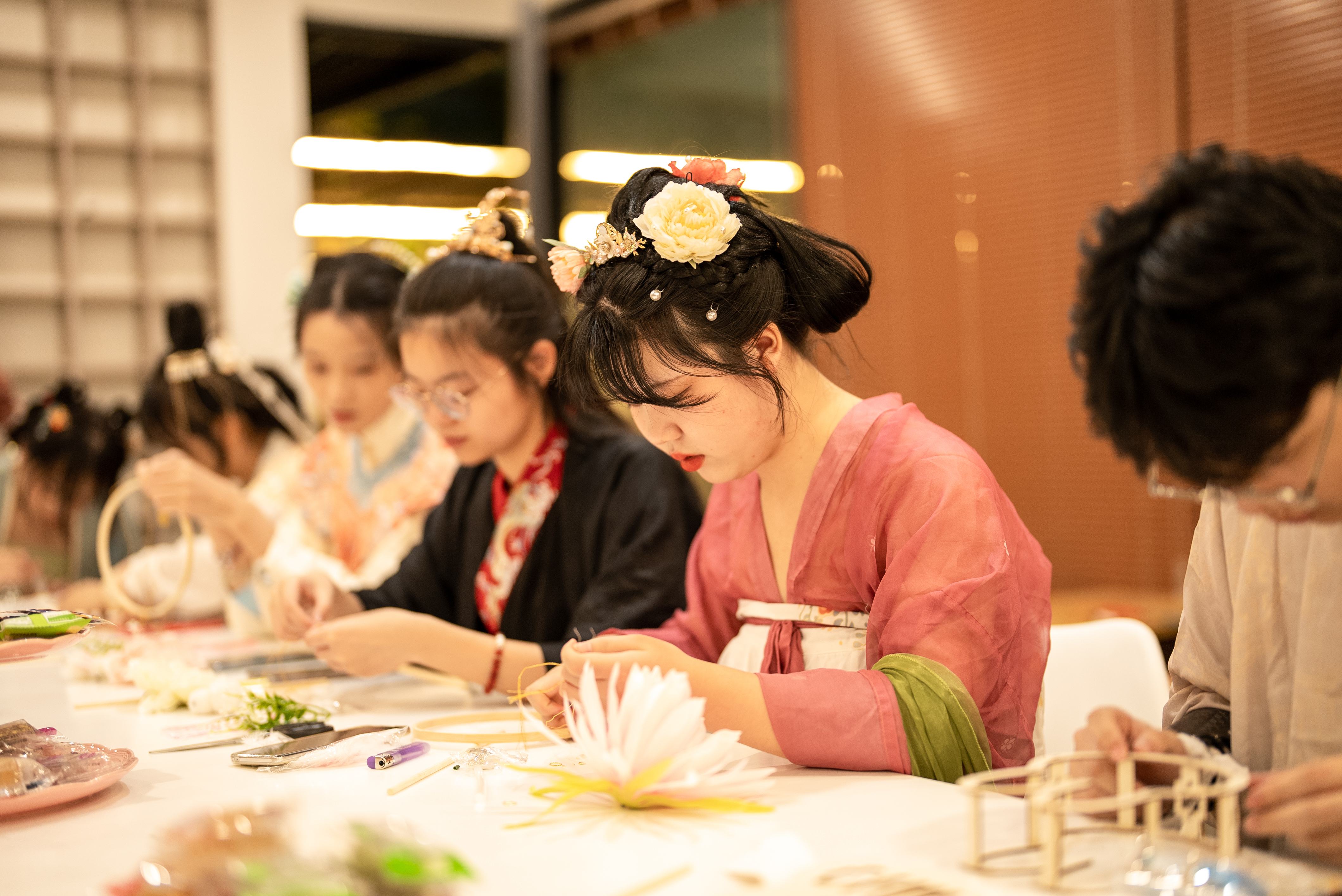 近日,来自9个学院23位同学身着汉服,在手指间感受一场穿越古今的时空对话,在实践中感受手工艺文化的源远流长,打卡了一场花好月圆之夜的特别邀约。本次活动由辅导员美育工作室和汉服社联合策划,为同学们搭建沉浸式感受文化内蕴、劳动之美的交流平台,激活中华文化的生命力,在传承与创新中弘扬华夏优秀传统文化,让传统文化“活起来”。