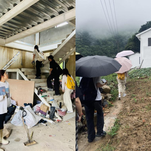 小组成员受到了小昆村负责人的热情接待,在工作人员的带领和讲解下,对该村落的整体风貌、村落现状及未来的发展思路有了大致的了解。小组成员冒雨进行中式茶馆及非遗馆两个项目地块的数据测量及各类资料的拍摄收集,并直观的分析了该村落的痛点难点,为后续的赛题设计累积了大量的一手资料。