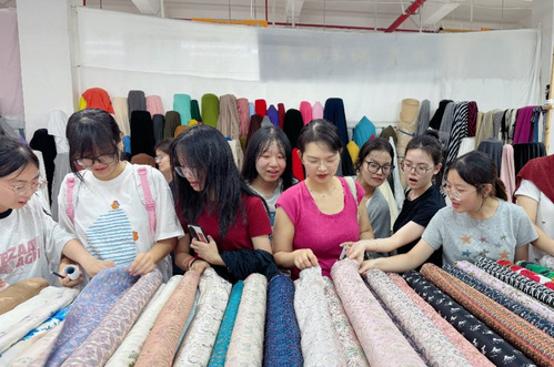 在授课教师吕叶馨的带领下,学生们亲身感受了棉、麻、丝、毛等不同材质面料的质感,针织和机织面料的特性,织花和印花工艺的区别……学生不仅可以看到平时课堂上无法覆盖到的丰富面料种类,还能够通过触摸、观察、与商家交流全面了解面料的质感、价格和流行趋势。学生们纷纷表示实践出真知,此次活动让他们受益匪浅,这种“眼见为实,手触为真”的体验式学习,不仅加深了他们对面料理论知识的理解,还进一步巩固了对服装材料的认知和应用能力。通过“沉浸式”的教学模式架起理论与实践的桥梁,不仅显著提升了教学效果,也为培养兼具理论与实践能力的全方位服装设计人才助力。