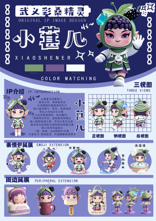 该作品巧妙融合桑葚果实与叶片的形态特征,通过拟人化设计赋予IP灵动的生命力。整体造型既彰显自然生态之美,又充满现代艺术张力。浙江盛世田园负责人表示,小葚儿IP以其清新活泼的视觉语言,精准传达了武义桑葚的独特品质,将成为企业品牌战略升级的核心视觉符号。