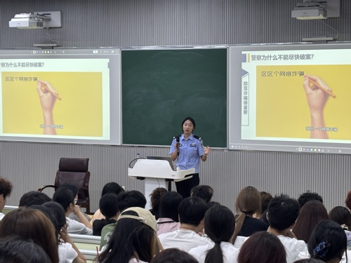 随后,西关派出所民警盛诗雨为同学们带来防范电信网络诈骗专题讲座。盛诗雨从当前高校发案率较高的诈骗类型入手,详细剖析了兼职刷单、虚假票务、游戏交易、冒充客服及“婚恋”交友等典型骗局,通过真实案例解读诈骗分子作案手法和心理操控过程。并在宣讲最后提醒同学们务必做到“不轻信、不透露、不转账”,牢记“六不三问”原则,对陌生信息保持警惕。