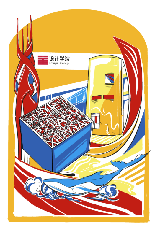黑色勾勒校园建筑轮廓,象征学术的坚实根基;黄色点缀细节,代表迸发的灵感与青春活力;橙色渲染热烈温馨的迎新氛围。视觉中心特别突出红色“五位一体”雕塑,呼应学校办学模式;天蓝色鲸鱼自知识海洋中跃起,喻示新生无限潜能与创造力。整套印章犹如一张梦想航图,寄托着学院希冀新生以专业为平台、以创意为帆,乘风破浪、实现成长飞跃的美好祝愿。