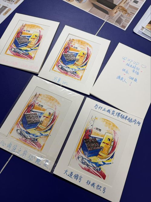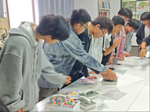 此外,师生们还走访了公共艺术实训中心的陶艺与木工实训室,在亲手触摸材料、观摩创作的过程中,感受艺术实践的独特魅力。活动中,每位“3+2”班同学还亲手制作了一套色印章文创相,并写下了对未来的寄语与期许。一位同学表示:“这次研学让我对专业有了更具体的认识,回去之后学习目标也更加明确了。”