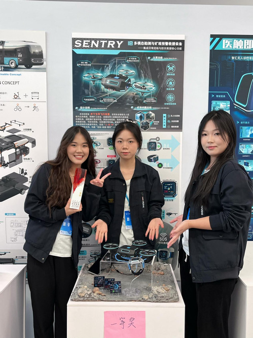 主题赛道高职组共有216件作品参赛,仅34件入围决赛。我校设计学院4件作品、智能制造学院3件共7件作品入围决赛,最终4项荣获一等奖。由设计学院邵恩雨、吴瑕、唐闻老师指导,杜畅畅、陈瑶瑶、韩佳璐同学完成的《多模态勘测与矿难预警救援装备》;邵恩雨、吴瑕、张文龙老师指导,徐一如、谢宇轩同学完成的《护悉—动能双愈护膝》;吴瑕、邵恩雨、詹秀丽老师指导,钟瑶瑶、曹丽娜、张竣翔同学完成的《O2—高海拔地区便携式制氧机共享基站》均获得一等奖,成绩斐然。此外,由邵恩雨、吴瑕、金德才老师指导,高梦雨、毛晓雯、汪弘杰同学完成的《隧道哨卫—隧道火灾救援与应急引导无人机群组》,荣获二等奖。