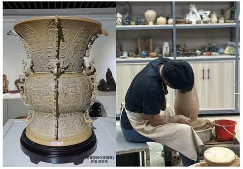 在设计学院,有着金德才老师负责的雕塑工作室、陶艺工作室,为学校的美育课程《婺州窑》授课,还经常为学院承接和举办研学、体验营等活动。郑志法老师为设计学院的外聘教师,参与工作室日常教学实践,他表示:“做婺州窑的时光最快乐,做作品的过程很专注。”在创作中融合传统与现代,既传承婺州窑工艺,也鼓励学生创新。这种创新思维在本次活动中体现——将传统婺州窑陶艺与教育传承相结合,赋予非遗新的时代内涵,也让我院尊老爱幼的美德在专业实践中绽放光彩,为美德传承注入了鲜活的艺术生命力。近期还在为“金职文创”事业部设计陶艺礼品,不久后校园文创将可见婺州窑陶瓷身影。
