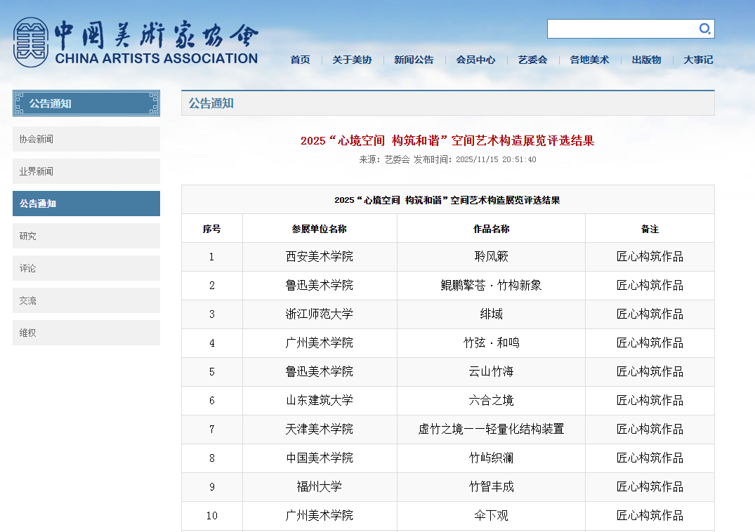 近日,由中国美术家协会环境设计艺术委员会、浙江省美术家协会、浙江师范大学、鲁迅美术学院共同举办的2025“心境空间 构筑和谐”空间艺术构造展览评选结果公布,我院管广清、胡佳钦师生团队创作的作品《圆汇融通》成功入选。