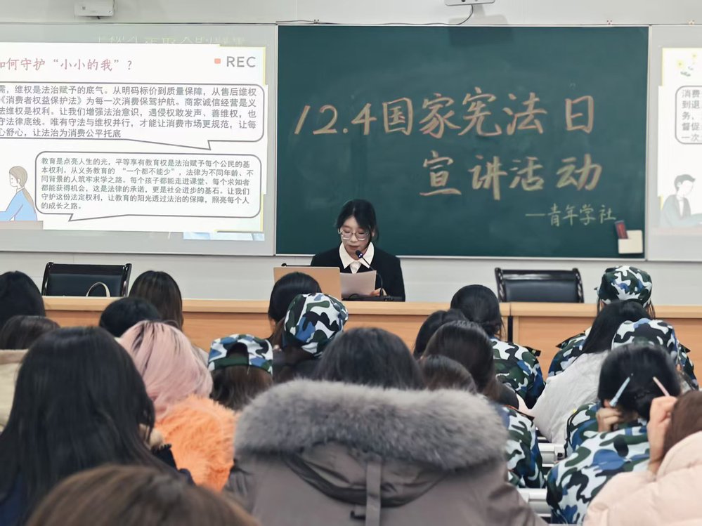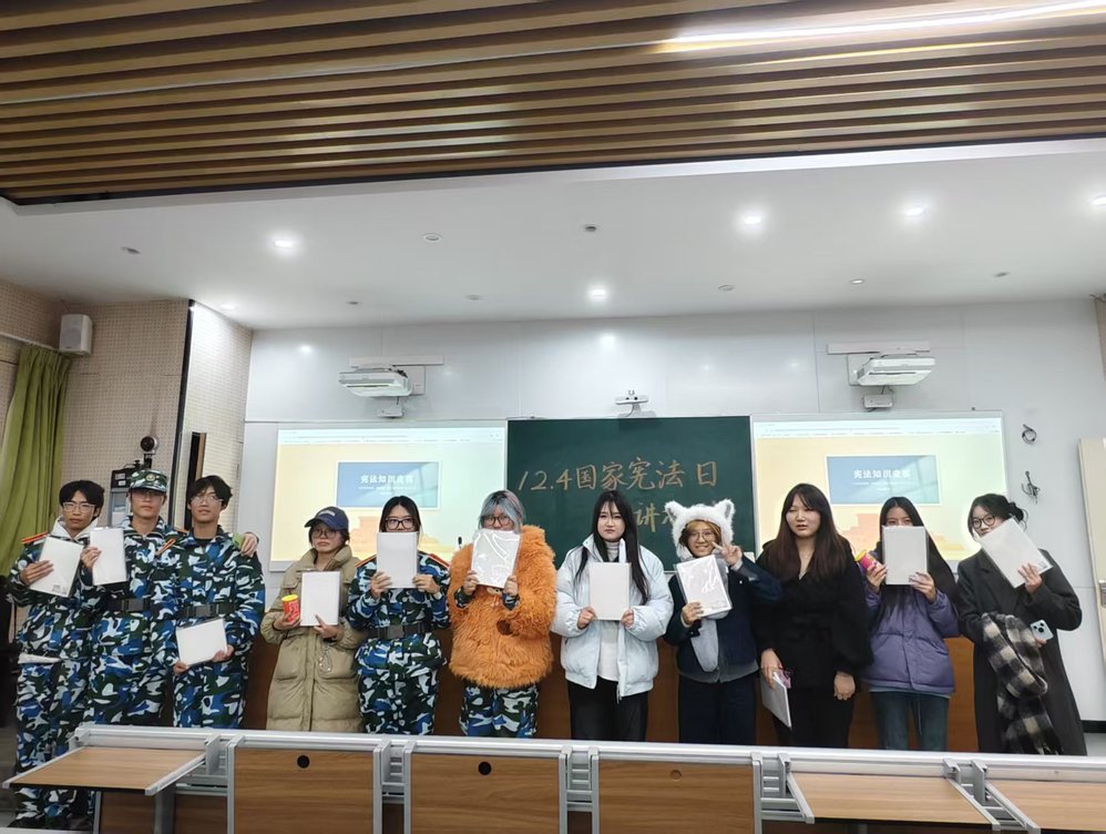 随后,青年社团成员艺术252班的徐琼同学以电影《小小的我》中刘春和的故事为例,阐释了法治、尊重与平等的现实意义。她指出,全民守法并非口号,而是全体公民、社会组织及国家机关的共同责任与行动。从遵守交通规则到履行纳税义务,从尊重他人权利到依法维护自身权益,每一个“小小的我”都在为构建有序社会贡献力量。活动还设置了宪法知识竞答环节,同学们踊跃参与,积极作答。竞答不仅激发了大家学习宪法的兴趣,也巩固了本次宣讲的学习成效,进一步推动形成尊崇宪法、维护宪法的校园风尚。