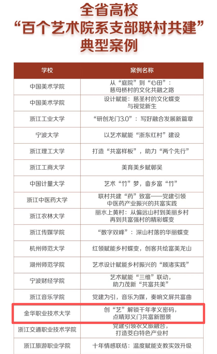 日前,中共浙江省委教育工作委员会办公室发布《关于公布全省高校“百个艺术院系支部联村共建”典型案例的通知》,我院艺术党支部报送的案例《创“艺”解锁干年孝义密码 点晴郑义门共富新图景》成功入选,成为全省20个典型案例之一。