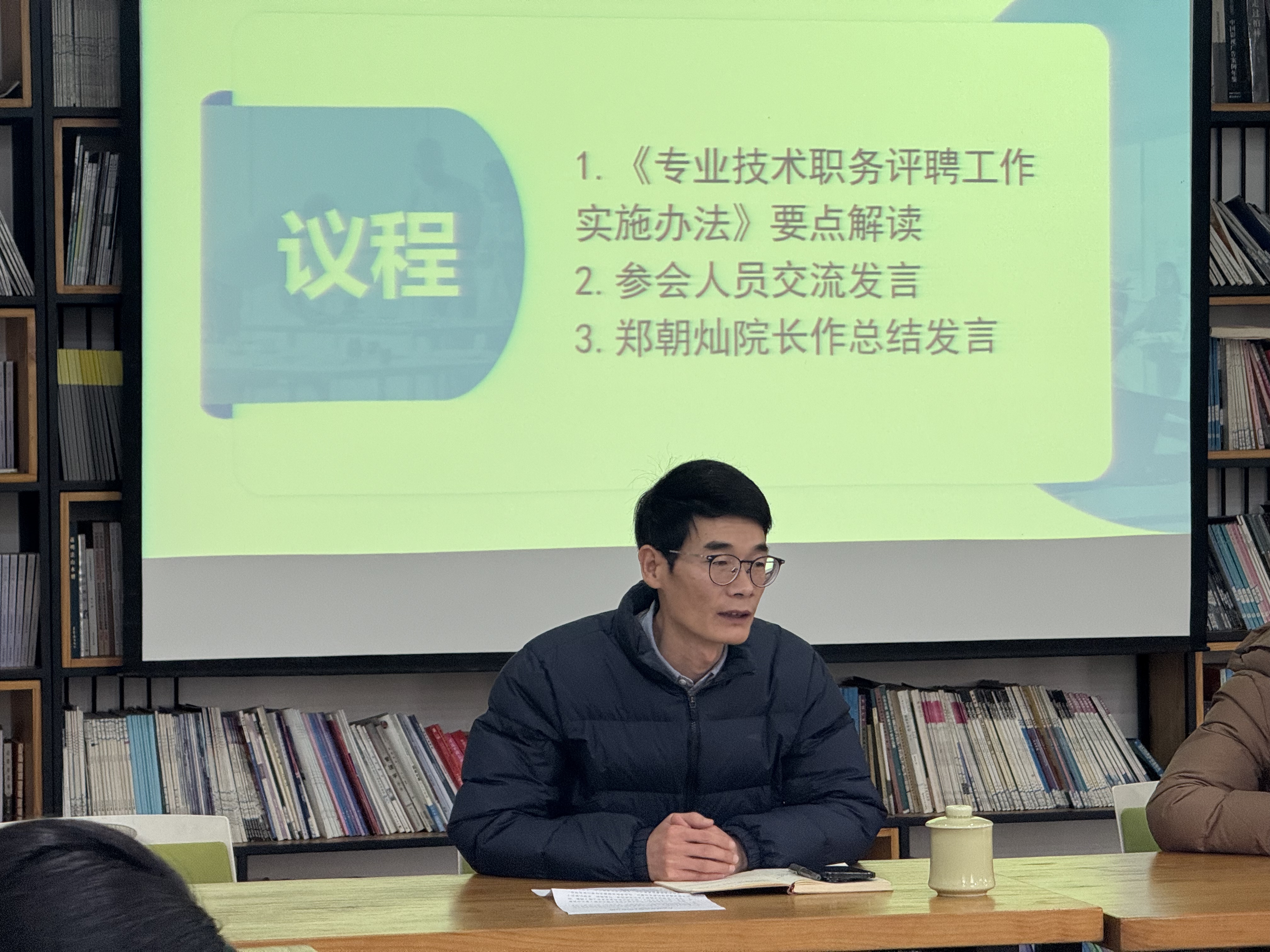 郑朝灿系统分析了学校现有职称结构及未来评聘趋势。他强调,学院高度重视专业技术职务评聘工作,持续关注教师职业发展和个人成长,学院教师们要把握机遇,锚定航向,在后续教学科研工作中要着力做到:第一,强化职称晋升意识,教师应将职称评聘作为提升自我的契机,持续增进专业素养与综合能力;第二,把握政策调整趋势,主动融入学校办学层次跃升后的职称加码氛围,在动态中优化自我定位;第三,整合多方资源,立足优势借智借力,积累成果补足短板,扎实积累高质量成果。